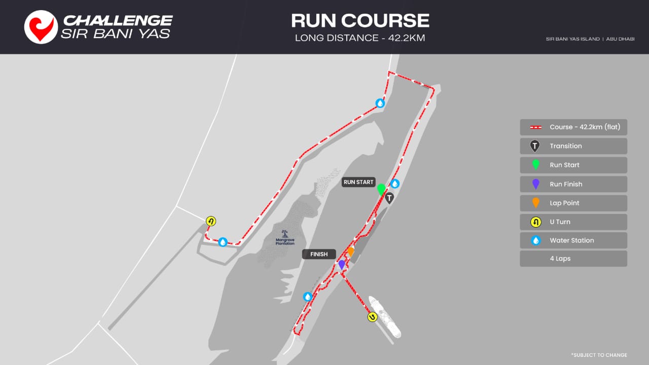 Expect atmosphere and scenery aplenty as you head out of T2 onto the run course at Challenge Sir Bani Yas. The run course is fast and flat, with each 10km lap taking you through the heart of the race village and along the coastal road before heading out into the tranquillity of the lagoon where you’ll have yet more opportunities to get a glimpse of the amazing wildlife. Middle distance racers will complete 2 laps of the course, while full distance competitors get to go round 4 times. With so much to see and so many opportunities for your support crew to cheer you on, the miles will fly by and you’ll be experiencing the spectacular finish line before you know it.