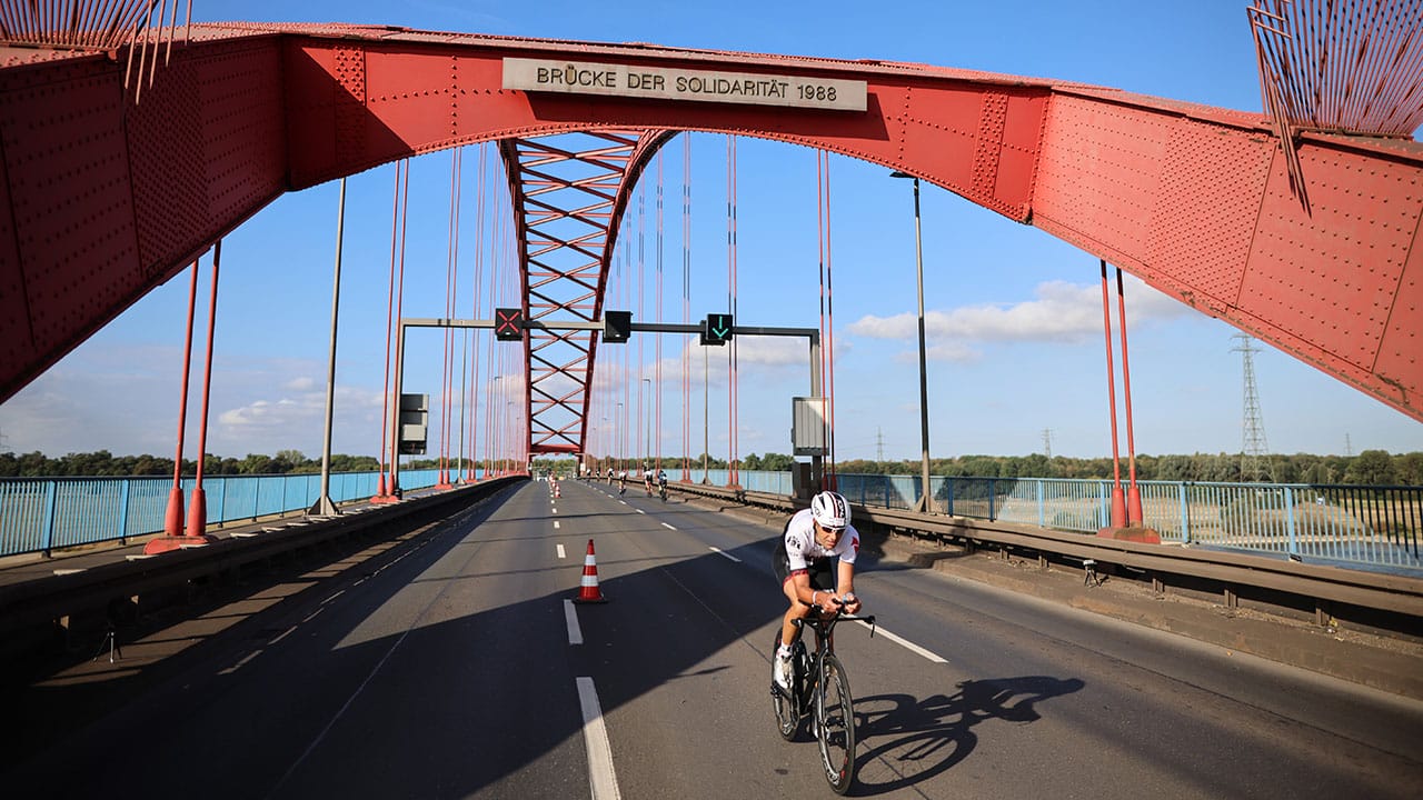After exiting transition, the mildly rolling, out-and-back course first takes you out of the Sportpark Duisburg through the western parts of the city and over the Rhine via the historic “Solidarity Bridge (Brücke der Solidarität) before heading along the river. After the U-turn, you double back to the Sportpark before starting your second lap. Thanks to smooth, closed roads, you can put the hammer down and go for that PB – definitely a course for aero-bars. And to keep you fuelled up there are feed stations at the 30km/60km mark.