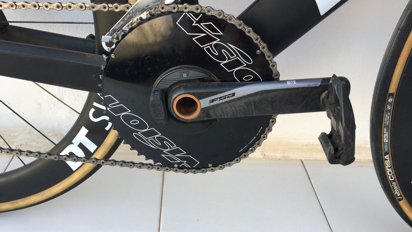 He also changed from a 54 tooth big ring to a 55. The substantial, solid Vision chainring is paired with an FSA PowerBOX power meter.
