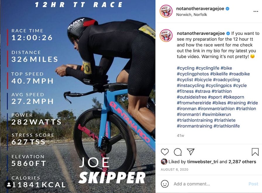 How accomplished a cyclist is Joe Skipper? To hold close to 300 watts over the bike-leg of sprint-distance triathlon, or just for 20 minutes, would be considered a very solid effort for the majority of top age-groupers. At the 2020 UK National 12-Hour Cycling Time Trial championship Skipper averaged an astounding 282 watts and covered a distance of 326 miles – just consider that again, he averaged over 280 watts for 12 hours!