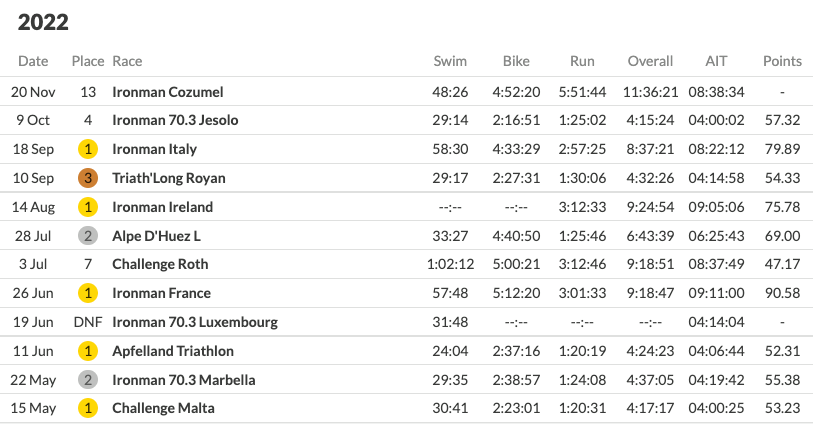 As you can see above, the Alpe D’Huez Long Course event (where she was second) was previously her third scoring event, with 69.00 points. With IRONMAN Ireland now included, her score there was assessed as 75.78. Swapping those out, her points average improved to 85.10 (for 32nd position), jumping up three places (82.84, for 37th).