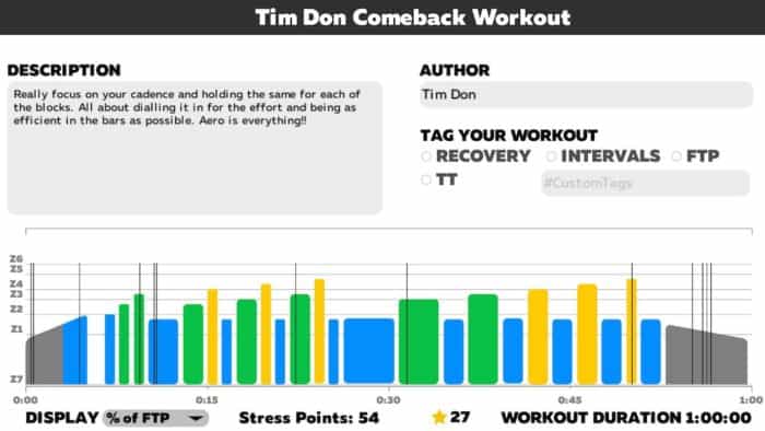 Make sure you have set your FTP level correctly before you join the workout as all the intervals are based on a percentage of FTP so it is important to get that right. If in doubt, dial the FTP number down 10 or 20 watts as it is better to finish the session than to feel like it is too challenging.