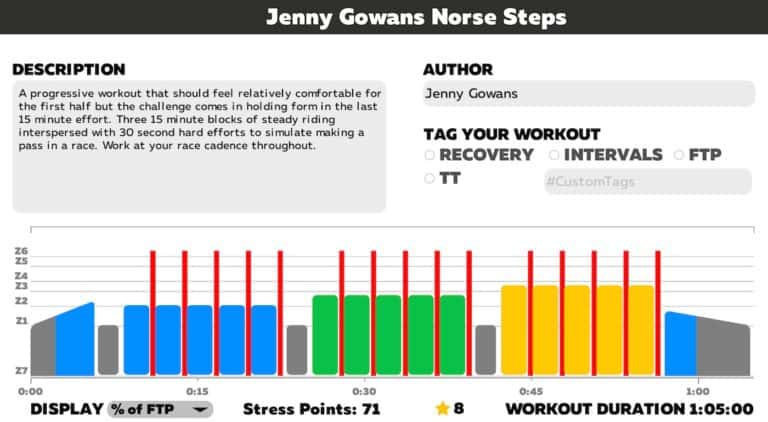 It starts off relatively comfortably… but gets progressively harder with each 15-minute block. The 30-second efforts are designed to simulate make a pass during a race. Don’t get over-confident if you think the first set is too ‘easy’… it will come back and bite!